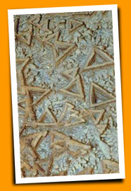 "May we remind you that calcite is the mineral with the most combinations of crystal structures: more than a thousand! The calcite found in caves is limited to a few crystal shapes which are always the same. Among them, the triangular shape, which has typical rhomboidal symmetry, was allegedly described for the first time by the mineralogist Des Cloizeaux in his Manuel de Minéralogie (Handbook of Mineralogy) in 1874 in the gallery of Eaux-Bonnes (Basses-Pyrénées). They can be observed both at the microscopic level, in the floating calcite (the calcite crystallizes in a thin layer at the surface of the bodies of water) as well as the centimetric or decimetric level, with triangular stalagmites (there are many examples measuring approximately one metre high and ten centimetres in diameter, in the Grotte de l'Aguzou, Ariège, France), and the hollow triangles in the pools of water." (Ph. Renault).